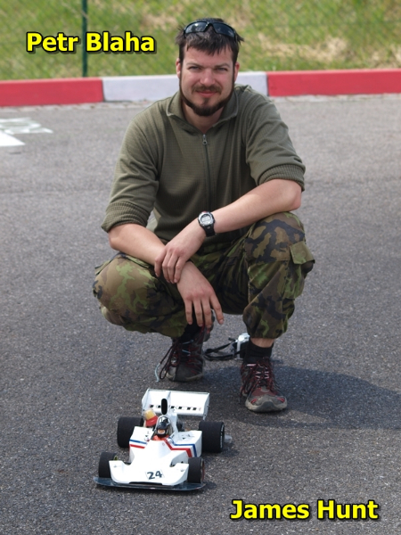 Systém závodu jsme zvolili obdobný jako byl u skutečných F1 vozů. Nechali jsme 45 minut běžet časomíru a v rámci této doby mohli jezdci zkoušet zajet nejrychlejší čas na jedno kolo. Nejrychlejším jezdcem a to o více jak jednu sekundu byl Drahoš Hejtmánek, který jednak to má v rukách a přece jenom jeho auto bylo technicky výše než u ostatních. Drahoš má sice vyráběný podvozek, ale s novodobým motorem, centaxem a dvoukvaltem měl nad ostatními navrch. Ovšem hlavní závod na 86 kol není sprint a může se stát cokoliv. Pořadí na startovním roštu bylo tedy následující: 1 – Laffite, 2 – Palmer, 3 – Hulme, 4 – Andretti, 5 – Lauda, 6 – Hunt a 7 – Ickx. Takové startovní pole nikde na jiném závodě nemáte šanci potkat 🙂